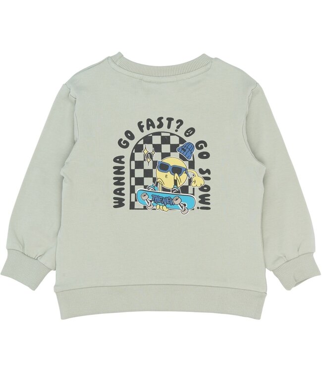 Het Stan-sweatshirt van THE NEW SIBLINGS is een trui met ronde hals voor peuterjongens, gemaakt van 95% katoen en 5% elastaan voor een lichte stretch. Het heeft lange mouwen en een geribbelde halslijn, manchetten en zoom. Op de borst is een kleine afbeelding te zien van een skateboarder met de tekst "GO SLOW". Het rechte model is gemakkelijk over een T-shirt te dragen en past goed bij jeans, joggingbroeken of shorts. De lichtgroene kleur is makkelijk te combineren voor dagelijks gebruik.